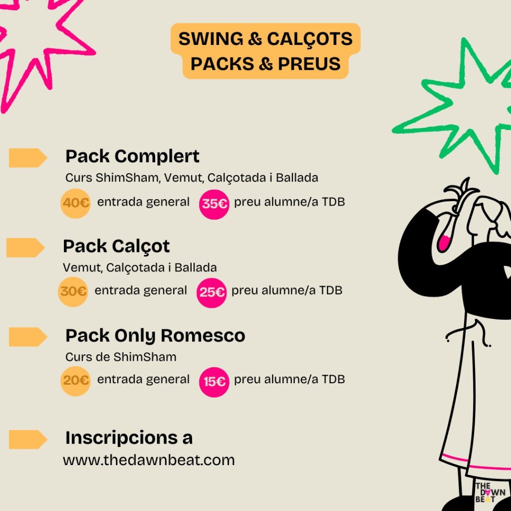 Tenim packs i preus per tots els gustos! Si no us agraden els calçots, podeu venir només al curs de ShimSham, però us recomanem el pack complert per gaudir (i per fer baixar) els calçots! 🙂